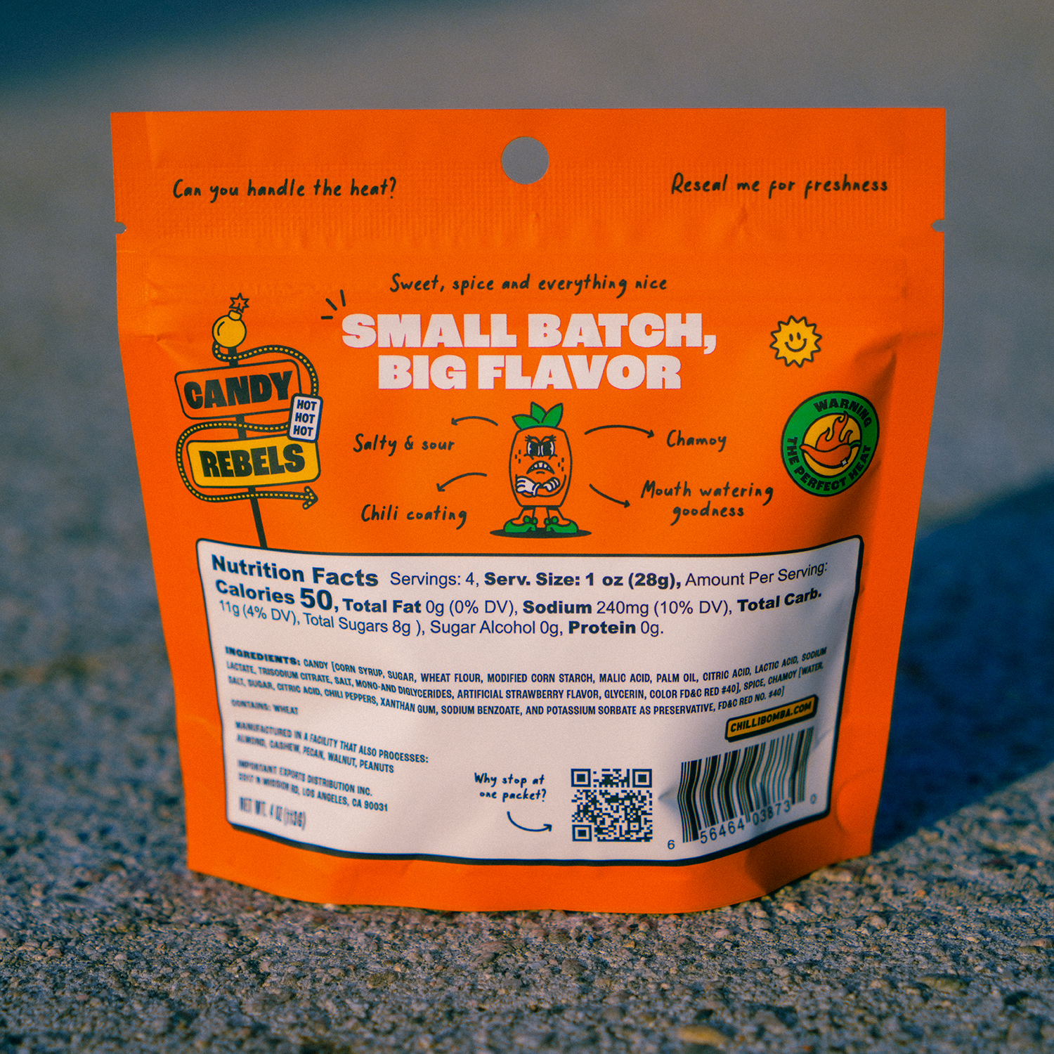 Think classic strawberry sour belts, but imagine them perfectly seasoned in our chili chamoy "bomb sauce" and chili limon seasoning. That’s what we’re serving with our Strawberry Belts. They’re juicy, chewy, sweet, and pack just the right punch of spice to keep things interesting.